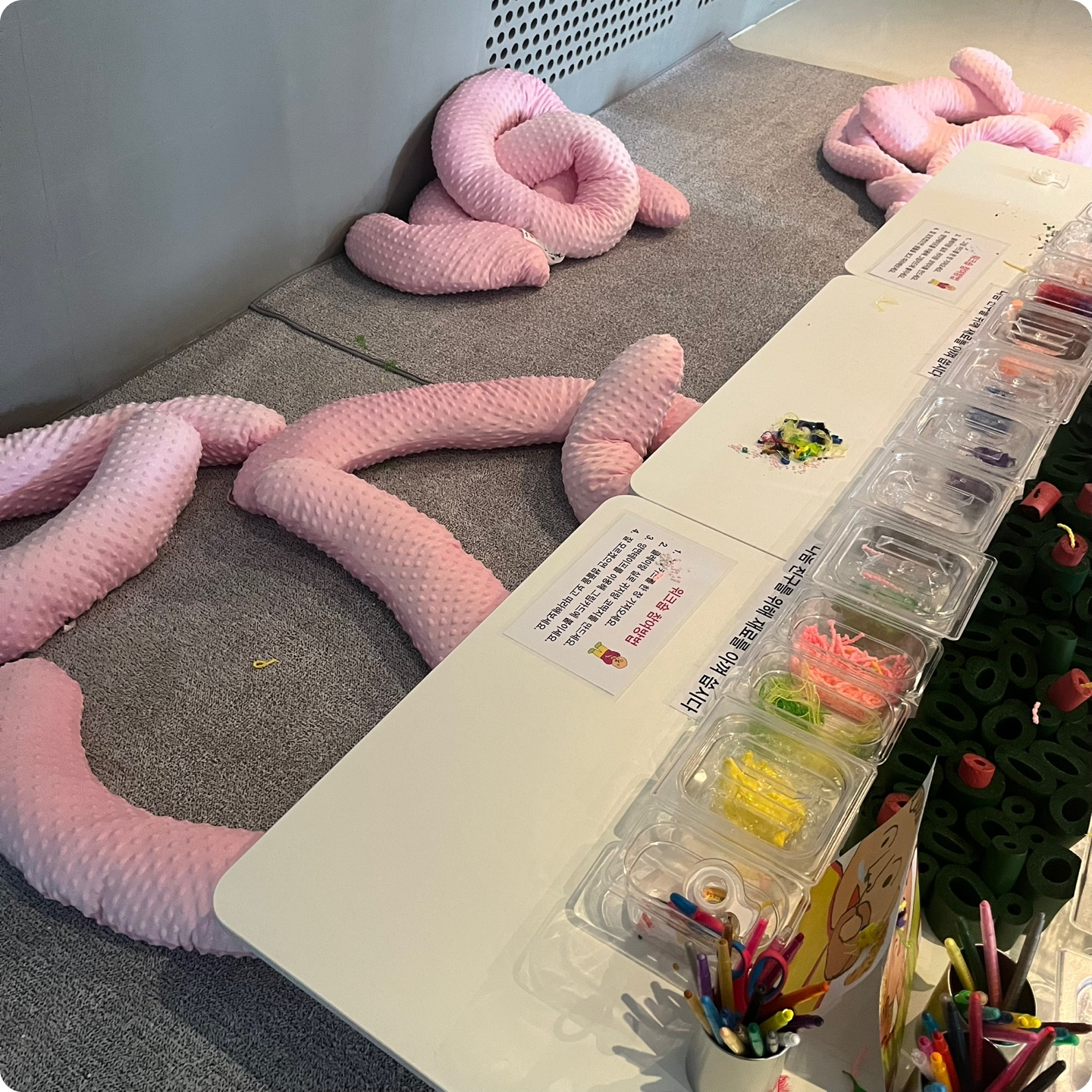전시회장의 한 편에는 관람객이 직접 작품을 착용하고 창작에 참여하여 준비된 물품으로 직접 배설물을 창작해 볼 수 있는 체험 공간이 있습니다. 실, 클레이, 반짝이 등 꾸미기 용품이 준비되어 있어 별다른 준비 없이도 그림 위에 배설물에 대한 생각을 표현해 볼 수 있습니다.