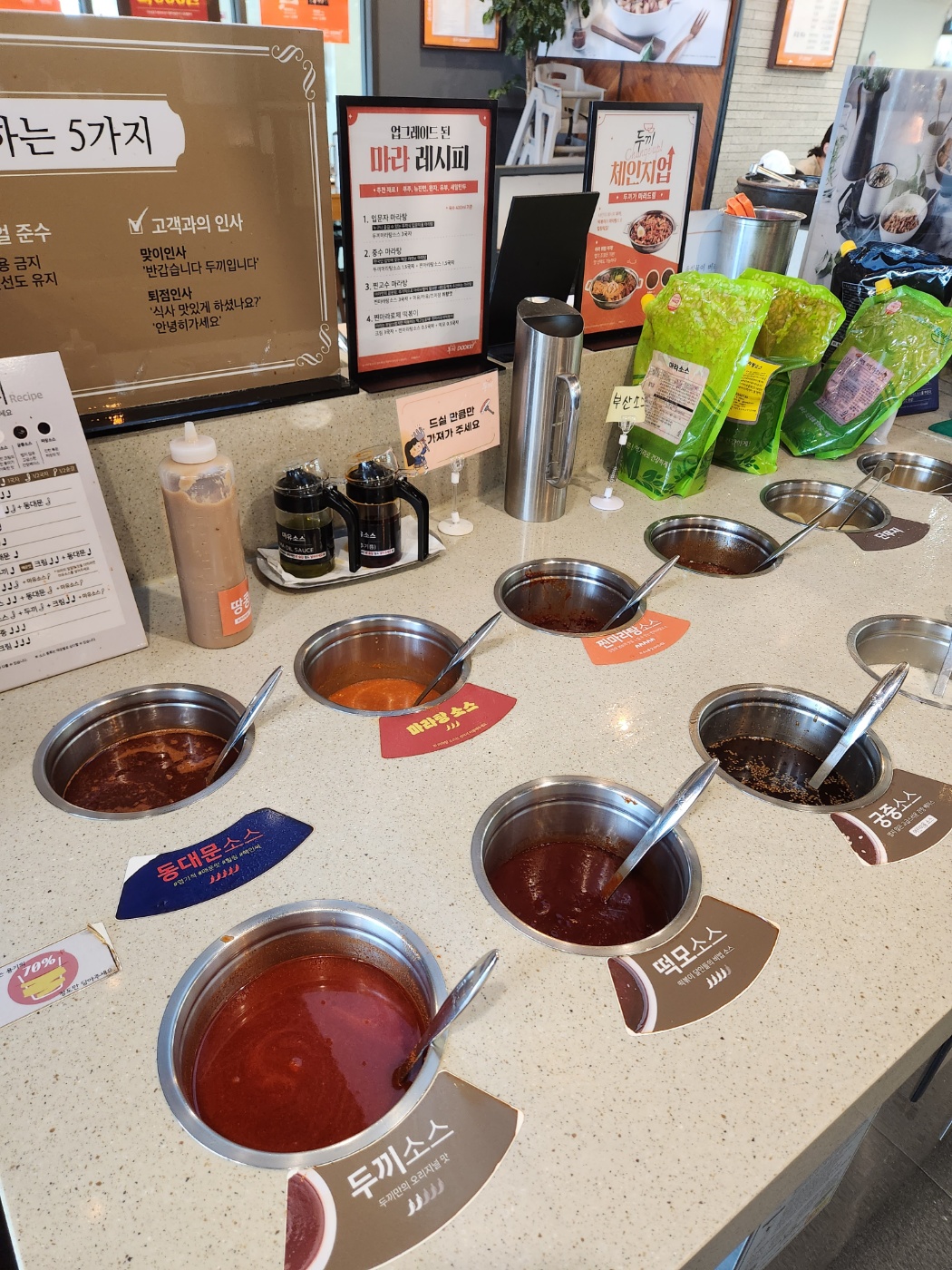 또한 두끼의 시그니처라고 부르는 소스들이 종류별로 준비되어 있습니다. 떡볶이를 원하시는 대로 입맛에 맞게 만들 수 있는 것이 장점입니다. 그리고 떡볶이 먹을 때 필수로 먹어야 하는 음료수도 준비되어 있습니다.
