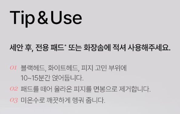 - 스팀 타월을 이용하거나 샤워 후 모공이 열린 상태에서 사용하면 더욱 효과적이에요.