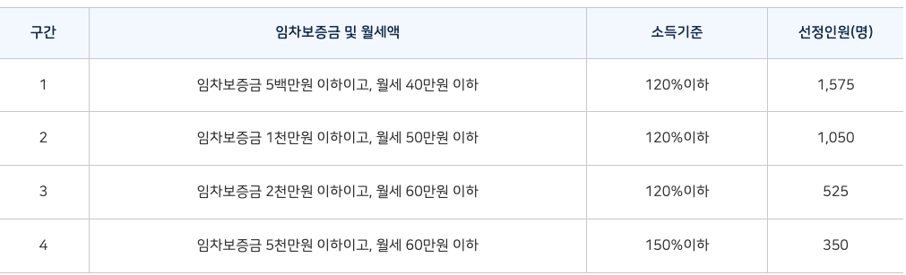 청년월세지원 선정 기준은 임차보증금, 월세 및 소득 기준 4개 구간으로 나누고 선정인원 초과시 구간별 전산 무작위 추첨입니다. 대상인원은 총 3,500명 입니다.
