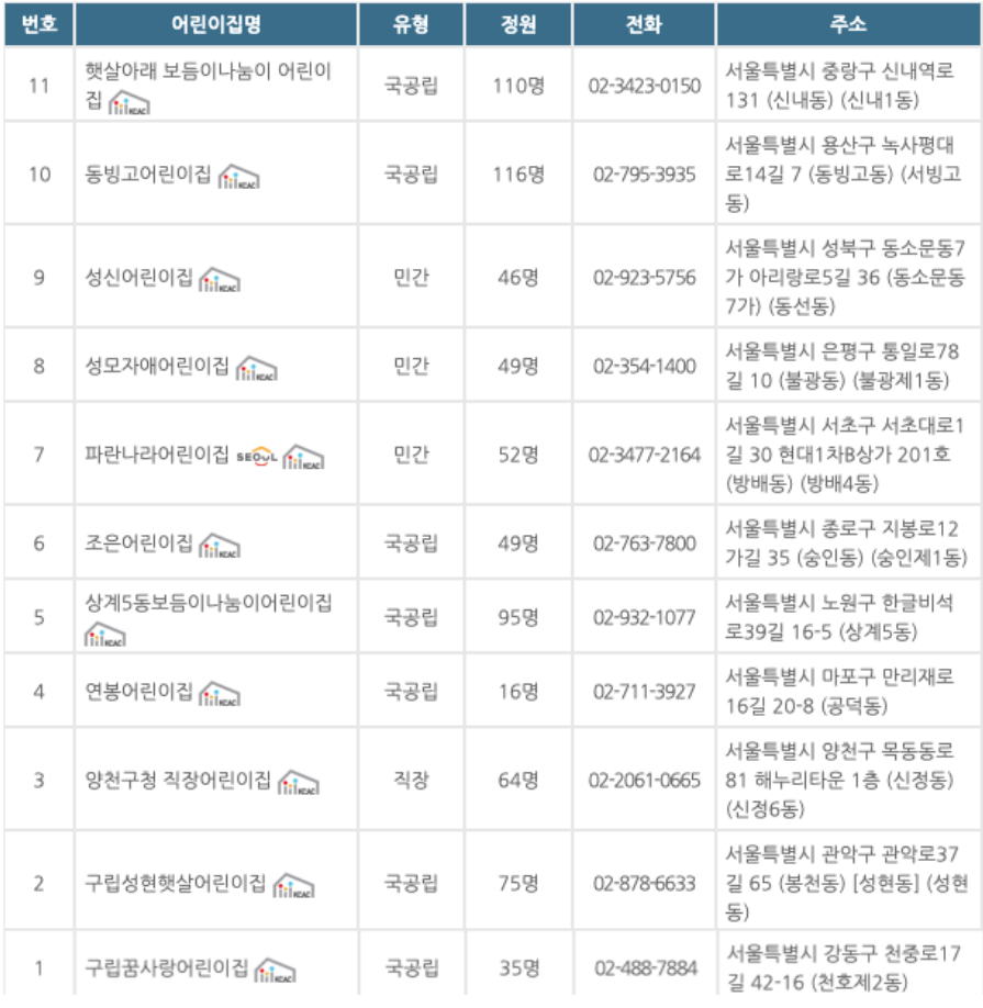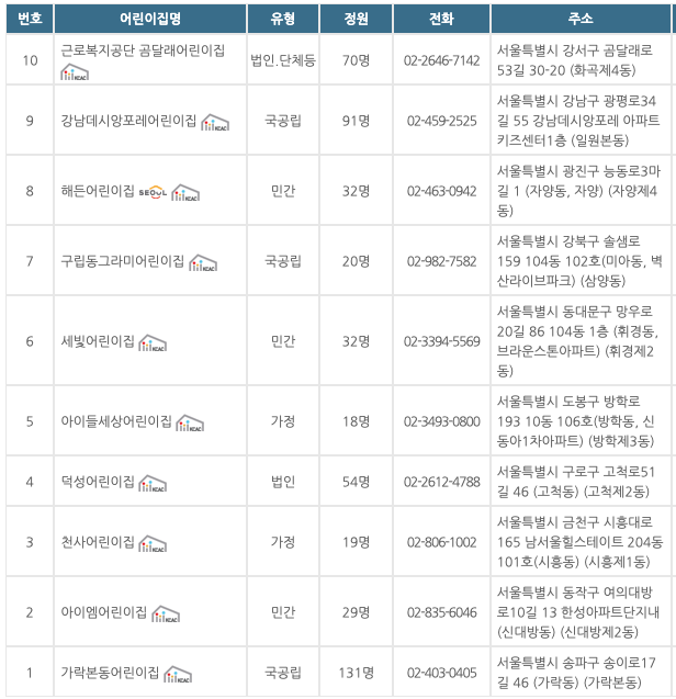 | 주말어린이집 | 서울시 거주 6개월~만6세 미만의 취학 전 영유아 | 토, 일요일 (09:00 ~ 18:00) (1.1, 설날/추석 연휴 제외) |