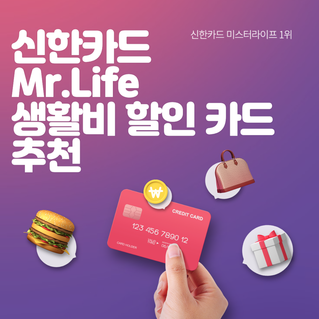 신한카드 미스터라이프 Mr.Life 카드는 매달 고정적으로 지출되고 있는 생활비를 할인할 수 있는 혜택이 제공되는 신용카드입니다. 전월 실적 30만 원 이상을 충족시키면 공과금, 편의점, 병원 약국, 세탁소, 온라인쇼핑몰, 택시, 대형마트등에서 10% 할인 혜택이 제공되고 있습니다. 신한카드의 미스터라이프 Mr.Life 카드를 발급하시어 생활비 할인 혜택을 받으시기를 바랍니다.