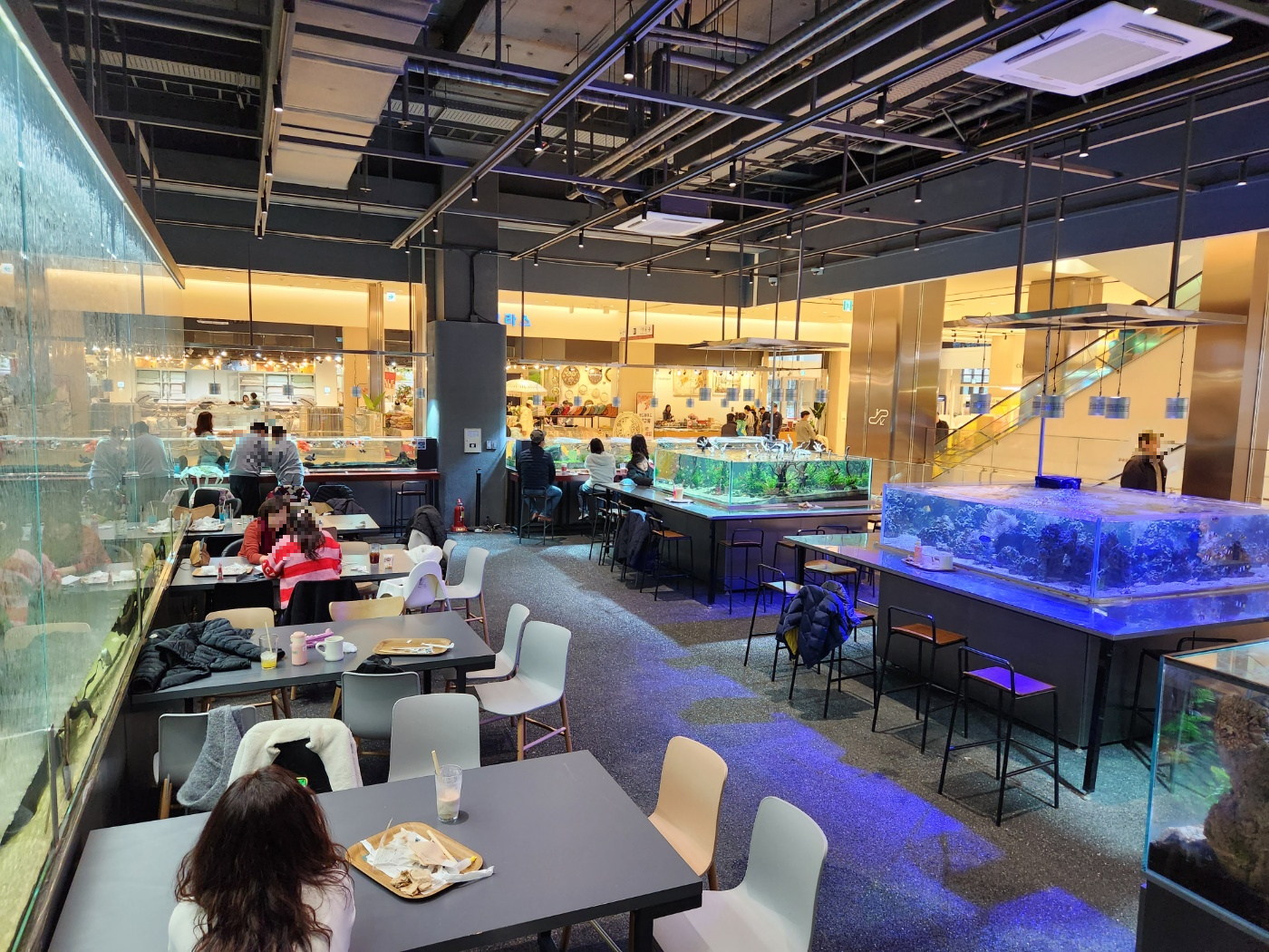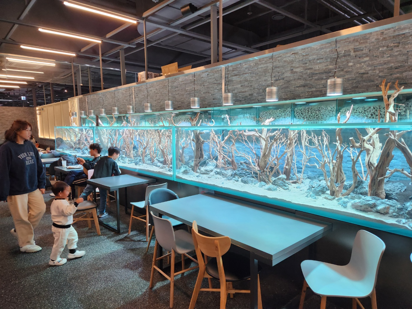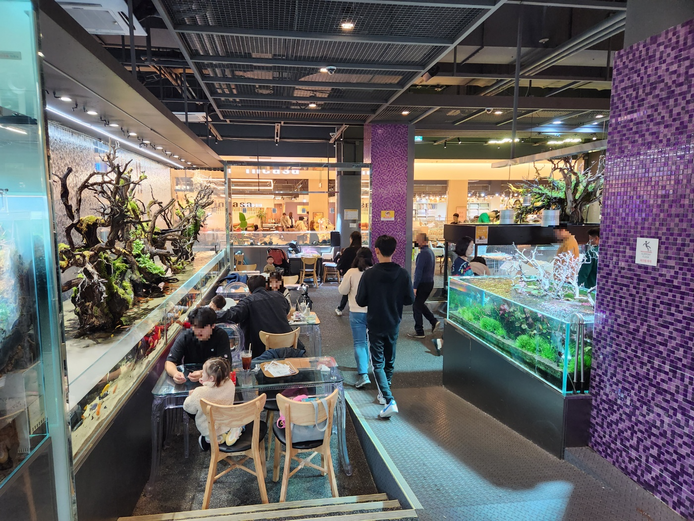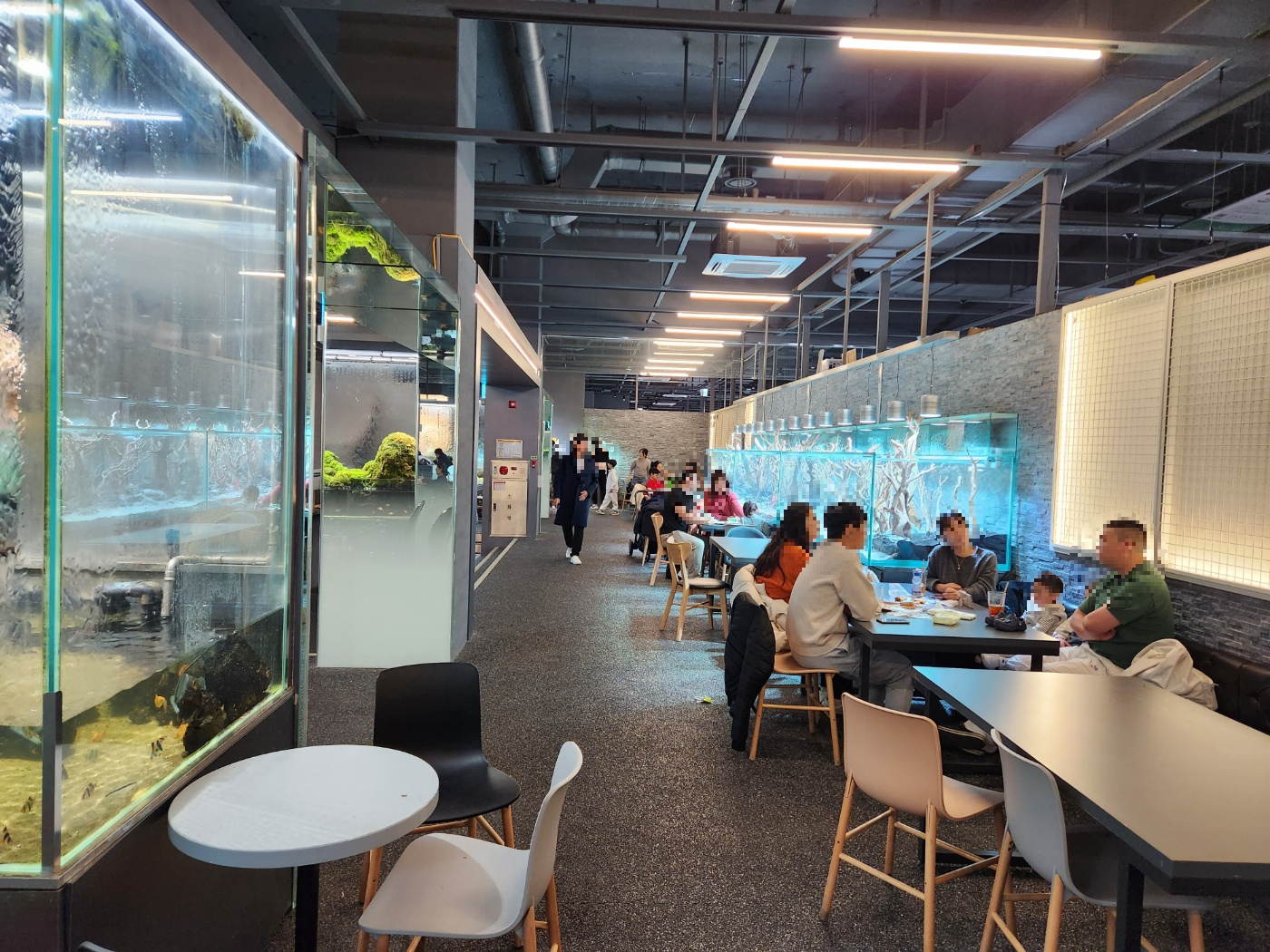 실내는 넓은 편이여서 주말에 갔음에도 여유로운 편이였습니다. 물멍을 할 수 있는 자리도 많이 있으며 가족단위의 넓은 테이블도 많이 있었습니다. 여유롭게 물멍을 한다던지 아이들이 물고기와 파충류를 구경 및 체험을 할수 있습니다.