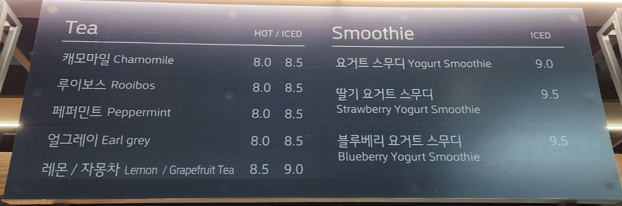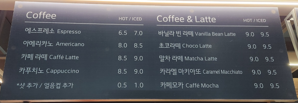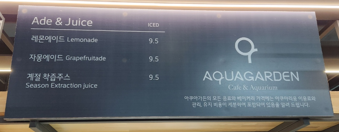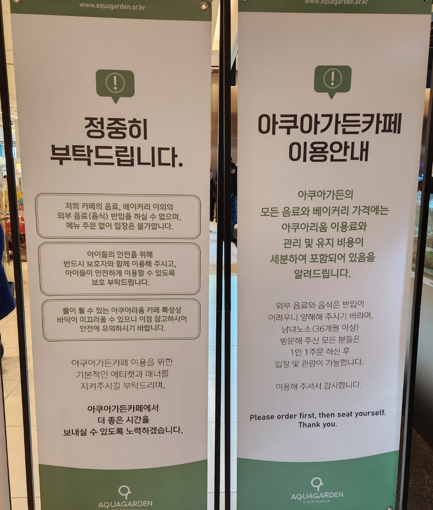 별도로 입장료는 없으며 1인 1주문 하신 후 입장 및 관람이 가능합니다. 그리고 외부 음료와 음식은 반입이 되지 않는 점 참고하시면 되시겠습니다. 아래는 아쿠아가든 카페 메뉴를 참고하시어 입장 후 키오스크로 주문하시면 됩니다.