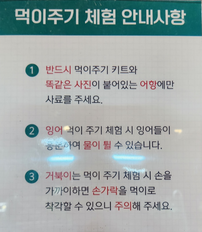 먹이주기 체험도 가능합니다. 키오스크에서 먹이를 구매하시고 먹이를 받아서 체험을 즐기시면 되시겠습니다.