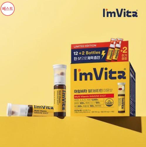 3초에 1병씩 판매된 아임비타 멀티비타민 제품입니다. 120년 역사의 DSM사에서 만든 고품질 프리미엄 비타민만 사용하고 있어서 믿을 수 있는 제품입니다. 하루에 1병에 가득 채운 프리미엄 올인원 멀티비타민으로 18종 영양성분으로 구성되어 있으며 특히 비타민 B군 고햠량으로 배합되어 있어서 다량으로 섭취해도 제내에 축적되지 않고 배출되는 비타민 B 군을 매일매일 고햠량으로 복용할 수 있습니다. 일상생활에 지쳐 활력이 필요하신 분이나 쉬운 섭치를 원하시는 분들께 적극 추천드립니다.