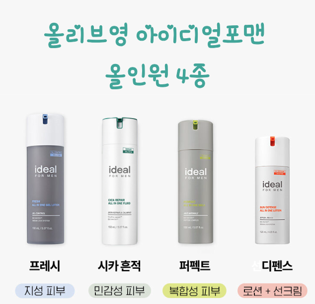 아이디얼포맨 올인원 제품중에서 가장 처음으로 나온 제품으로 복합성 피부에 적합한 올인원 로션입니다. 저도 아이디얼포맨 제품을 구매할 때 이 제품을 처음 사용해 보았는데, 경험적인 가장 만족스러웠던 부분은 끈적거림이 없고 산뜻한 느낌이 있었고 은은하고 상큼한 향도 부담스럽지 않은 기분 좋은 향이 만족스러웠습니다. 퍼펙트 제품으로 스탠다드한 올인원 제품을 구매하시는 분들께 적극 추천드립니다.