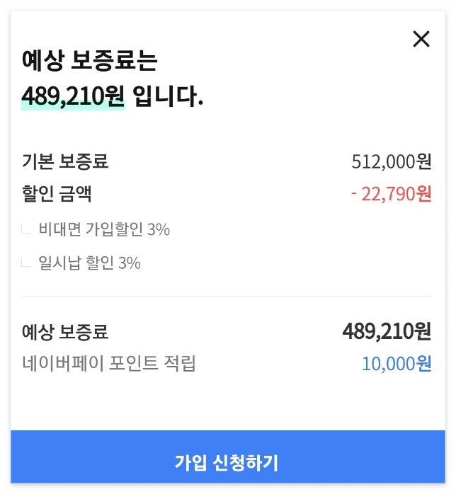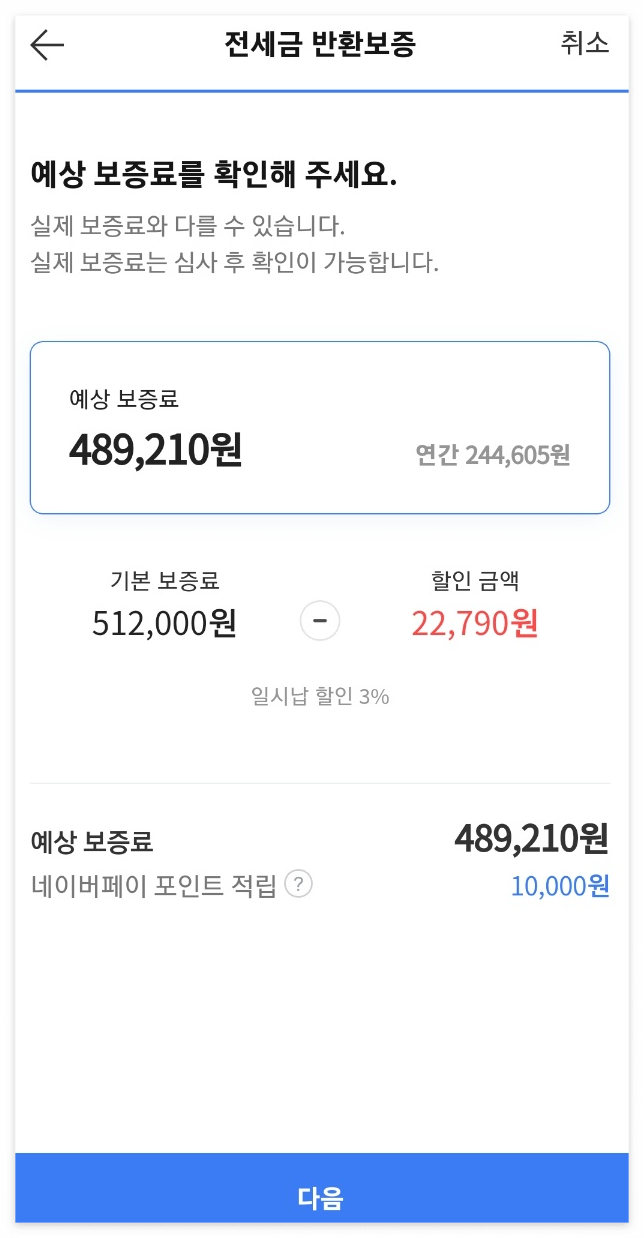 실제로 2억 전세금으로 보증보험 2년 가입 시 512,000원이었는데, 할인이 22,790원, 네이버포인트 10,000원으로 32,790원 비용을 아낄 수 있습니다.