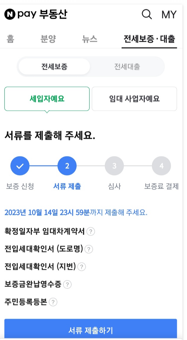 너무 쉽죠?!! 서류가 준비되어 있다면 서류제출 버튼을 누르고 준비가 안되었다면 다음에 제출하기 버튼을 눌러서 다음으로 넘어갑니다.