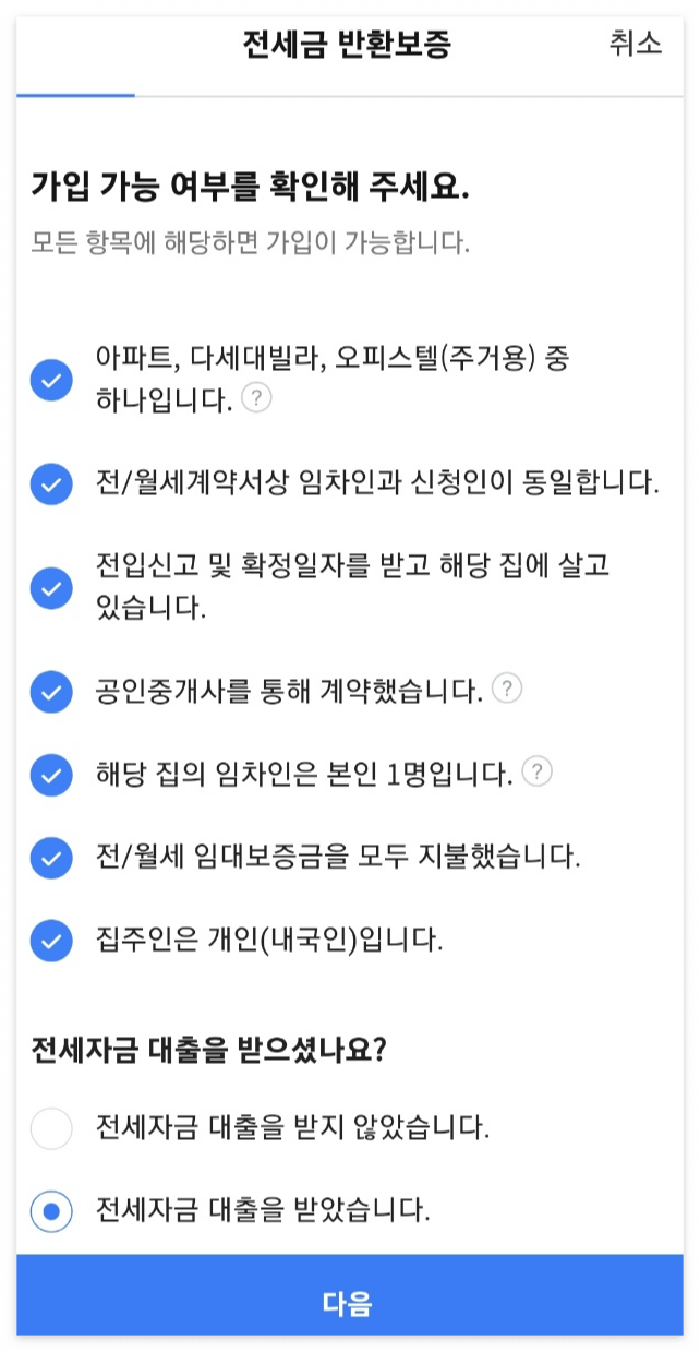 - 공인중개사가 중개한 계약이어야 하며, 동사무소에 확정일자와 전입신고는 필수로 진행되어야 합니다.