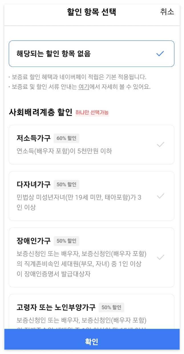 추가적으로 할인 항목을 선택하여 본인에게 맞는 할인항목이 있는지 확인 후 선택해 줍니다.