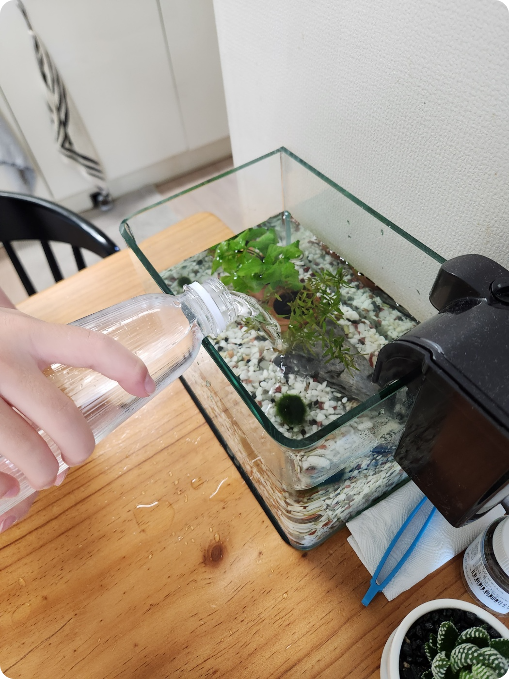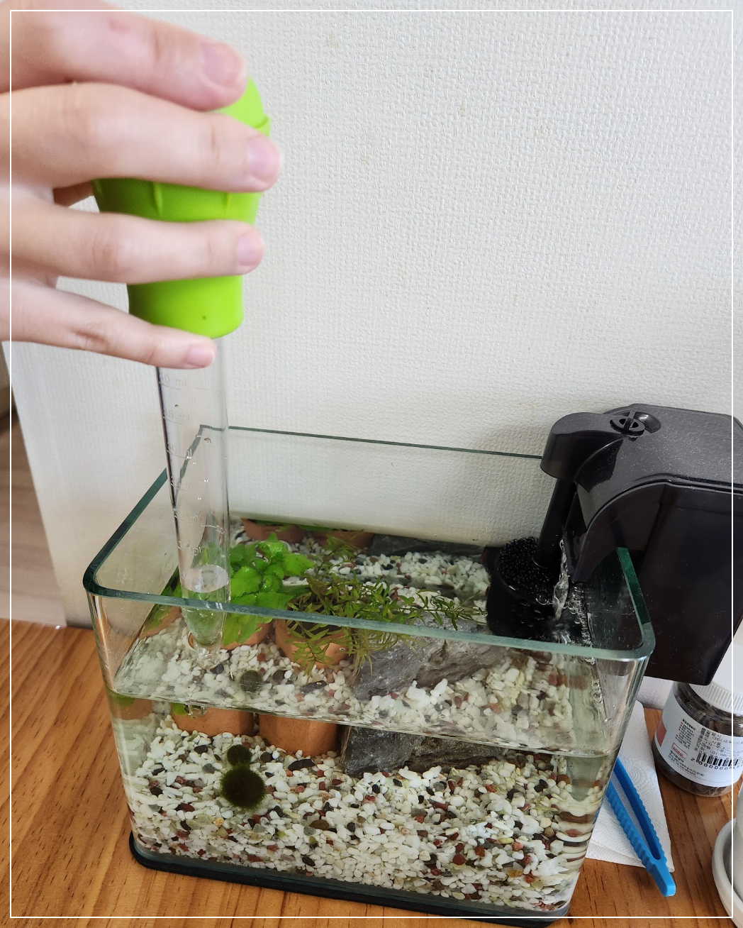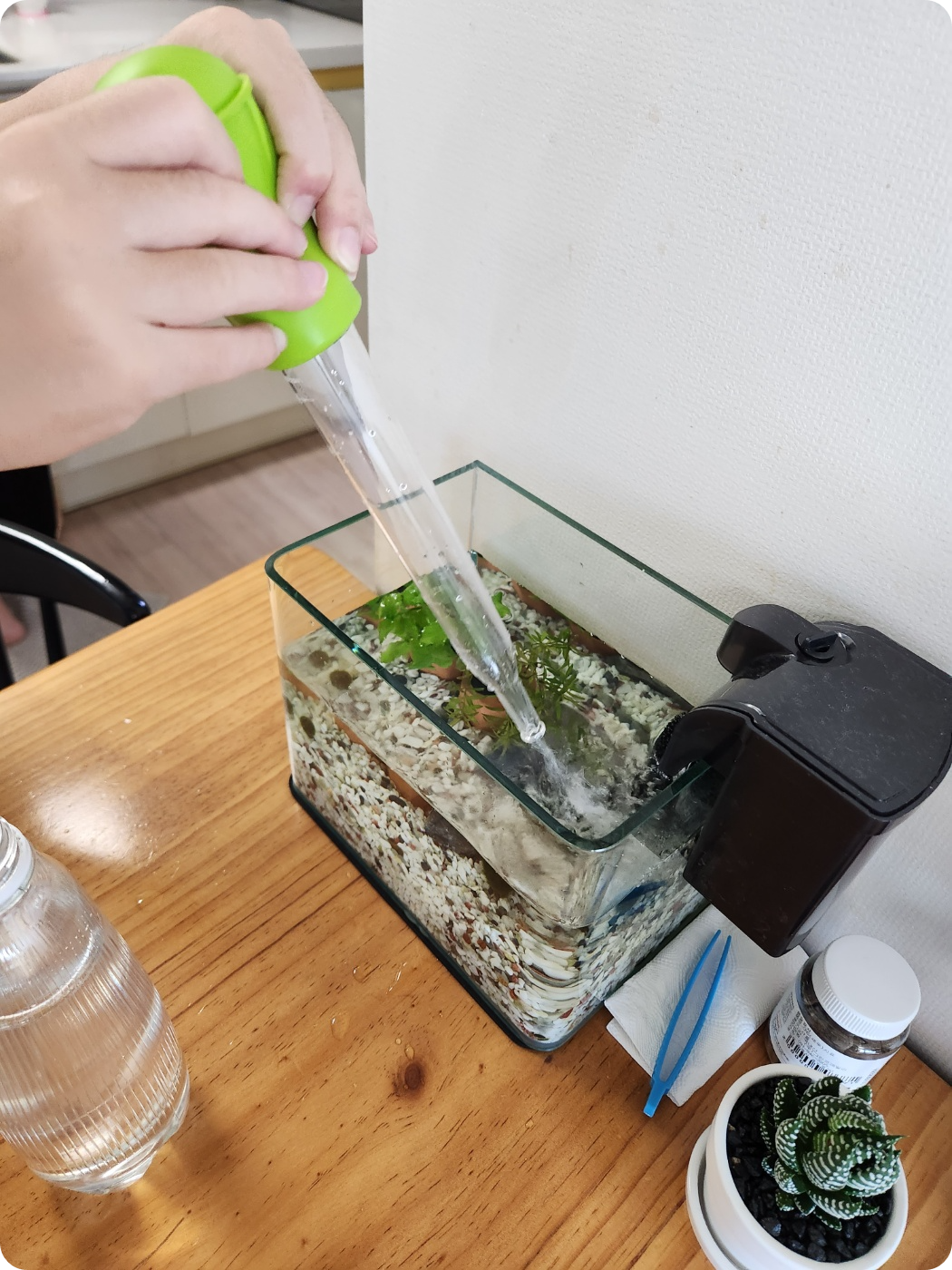 새우들은 물에 민감하기 때문에 한번에 물을 모두 갈아주면 죽을 수 있습니다. 그래서 물의 큰 변화를 주지 않고 1/3 정도만 갈아주는 것이 좋습니다. 저희는 어항 물갈이용 스포이드로 물을 1/3 정도 빼주고 PT병에 받아놓은 물을 넣어주었습니다.
