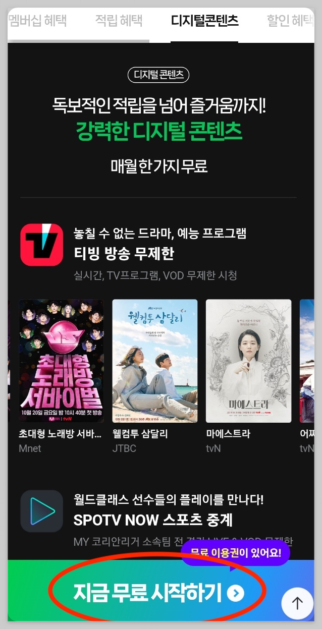 디지털콘텐츠 탭으로 이동하면 티빙 한달 무료 정보를 확인할 수 있다. 지금 무료시작하기 버튼을 클릭하여 가입을 진행한다.
