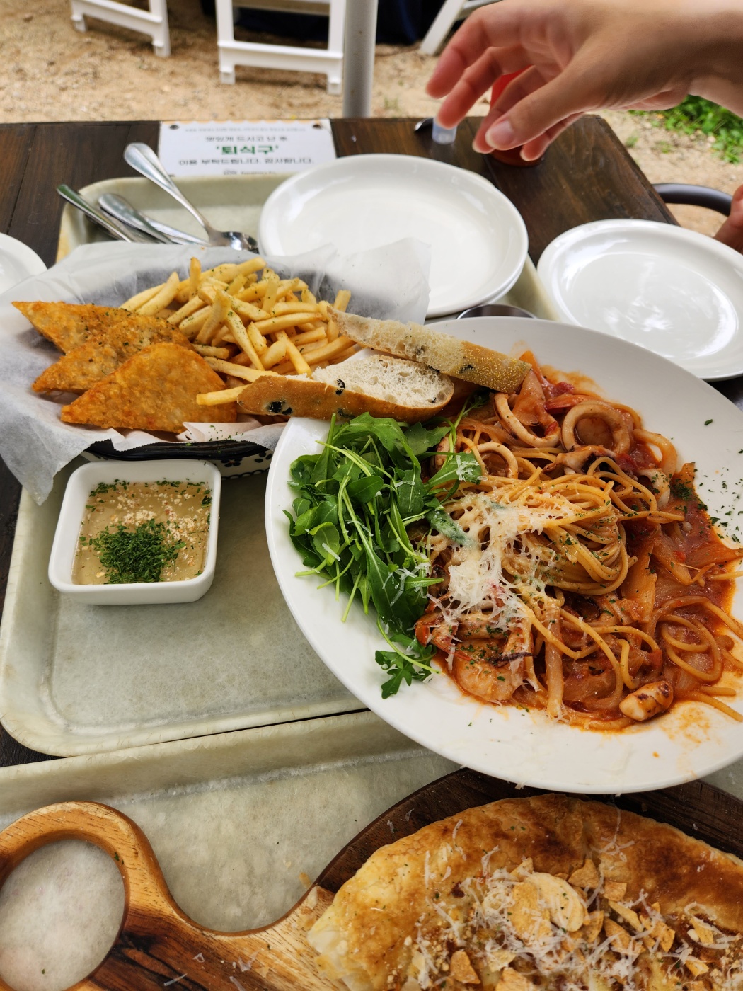 물놀이를 하고 배가 고파서 음식을 주문하였습니다. 피자와 파스타 감자튀김을 주문해서 냠냠했습니다. 아이들이 물놀이를 하고 나니 먹는 것도 더 잘 먹습니다. 포시즌어데이는 서울 근교 카페 맛집답게 피자와 파스타 정말 맛있습니다.