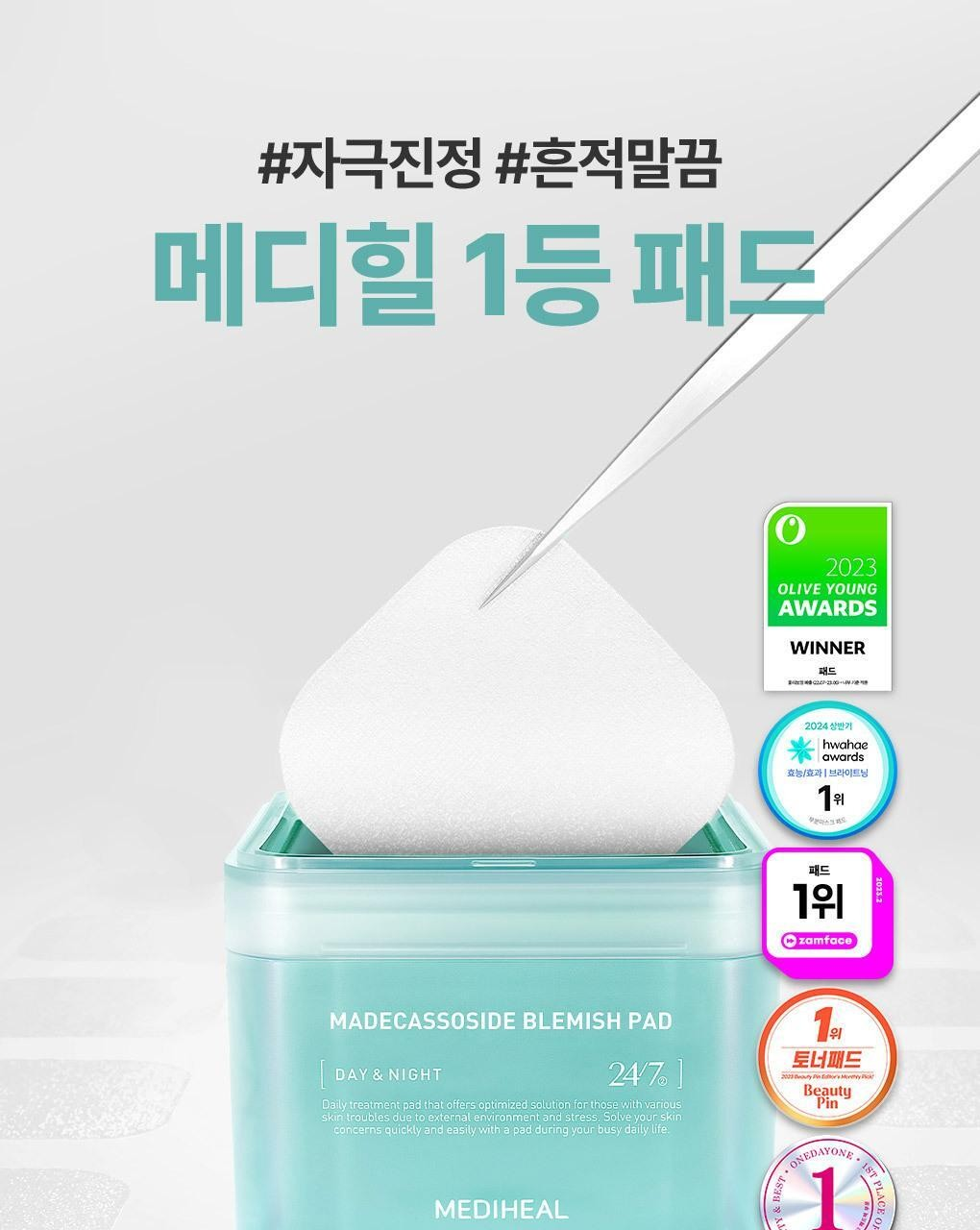 메디힐의 일명 네모패드라 불리는 ‘마데카소사이드 흔적 패드’가 국내·외에서 인기를 얻고 있는데요, 네모패드는 피부 고민에 맞춰 사용할 수 있도록 7종으로 출시됐으며 국내외 매체에서 누적 35관왕을 수상하는 등 그 제품력을 입증받고 있습니다.