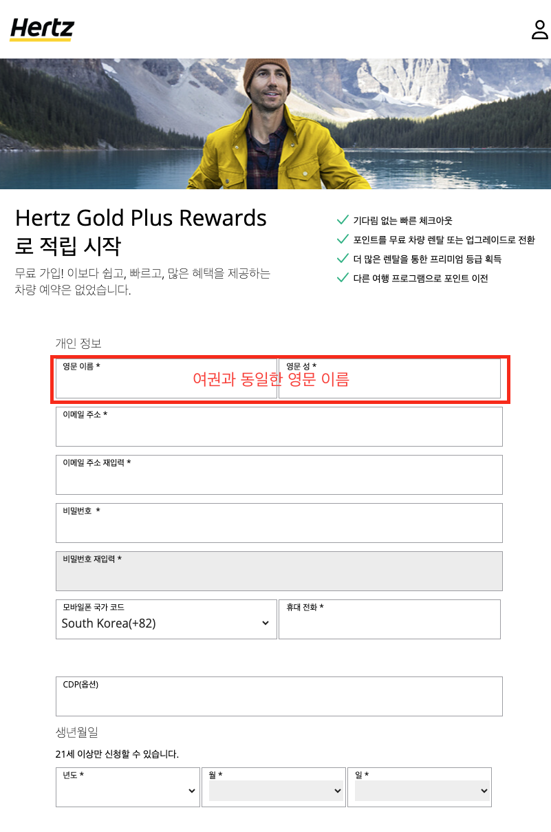 허츠 골드회원은 허츠 사이트에서 무료로 가입할 수 있습니다. 5~10분 정도면 됩니다. 준비물은 여권, 신용카드, 국내면허증을 준비해 주시면 됩니다.