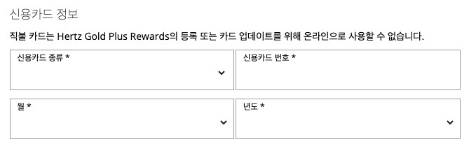 신용카드 정보를 입력하시면 됩니다.(체크카드는 안됩니다.) 실제로 현지에서 차량 픽업할 때 등록된 신용카드를 제시해야 하므로 여행 가실 때에는 신용카드를 꼭 잘 챙겨가시면 되시겠습니다.