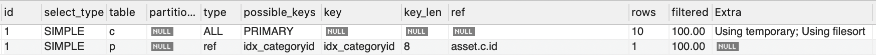 빠른 쿼리다! Mysql 옵티마이저에 의해 드라이빙 테이블이 product 로 선택이 되었고, 드리븐 테이블은 category 로 선택이 되어서