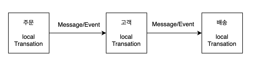아래 그림과 같이 각 로컬에서 데이터를 업데이트 하고, Message or Event 를 다음 로컬 트랜젝션으로 전달하는 방식이다.